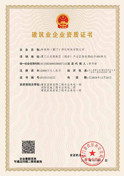 科锐特(厦门)历经13年发展,已拥有6项高级资质(装修装饰工程专业承包壹级资质,机电安装工程专业承包壹级资质,消防设施工程专业承包贰级资质,工程设计专项乙级资质,钢结构专业承包贰级资质,环保工程专业承包贰级资质) ;15项专利证书;通过4项国标认证体系。